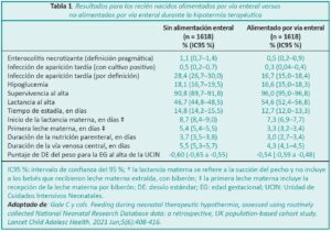 Interpretación: la enterocolitis necrotizante es rara en neonatos que reciben hipotermia terapéutica. La alimentación enteral durante la hipotermia es segura y se asocia con resultados beneficiosos en comparación con no alimentar. En base a estos hallazgos, los autores apoyan la alimentación con leche durante la hipotermia terapéutica.