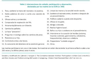En el artículo de Çakmak y Karaçam se mencionan en detalle las intervenciones realizadas por las madres en la UCIN (ver Tabla 2), algunas de ellas observando y en otras participando. Ambas son consideradas efectivas; los padres no sólo tienen que ser operadores en las intervenciones para ofrecer beneficios al paciente; primero tienen que estar presentes junto a su hijo. Presencia que no debiera estar condicionada por la gravedad del paciente o por el procedimiento a realizar.