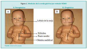 Método NEMU: es el acrónimo de las palabras en inglés “Nose-Earlobe-Mid Umbilicus” correspondiente a la medición desde la nariz o la comisura de la boca, al lóbulo de la oreja y al punto medio entre el apéndice xifoides y la cicatriz umbilical (Figura 1). En la colocación orogástrica se mide desde la comisura de la boca.
